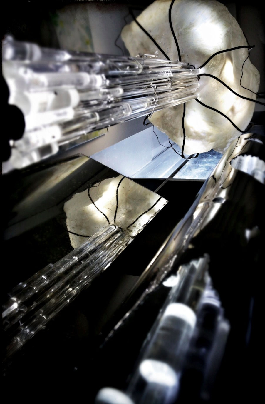 Sculpture lumineuse acier, plexiglas, résine, matières végétales, matières mixes, motorisation (nuage et base) Hauteur 300 cm, Largeur des branches environ 300 cm.